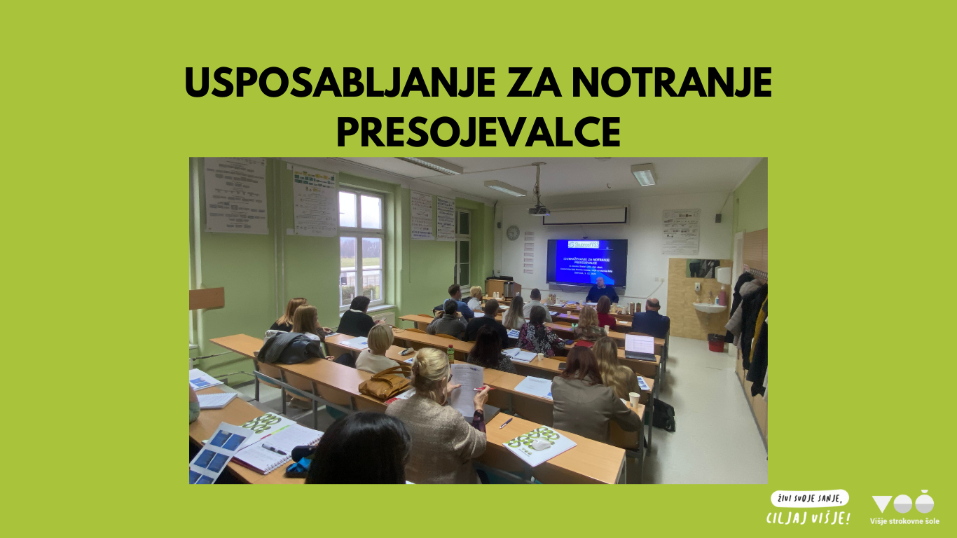 Na Šolskem centru Šentjur smo uspešno izvedli Usposabljanje za notranje presojevalce v procesu zagotavljanja kakovosti na VSŠ, na katerem so udeleženci spoznali ključne vsebine za samostojno izvajanje notranje presoje in najpogostejše izzive ter v simulaciji presoje oblikovali zaključne ugotovitve in poročilo. Zahvaljujemo se vsem udeležencem in dr. Branku Škafarju, ki je vodil dogodek. V januarju že načrtujemo začetek pedagoško-andragoškega izpopolnjevanja, o katerem vas bomo pravočasno obvestili.