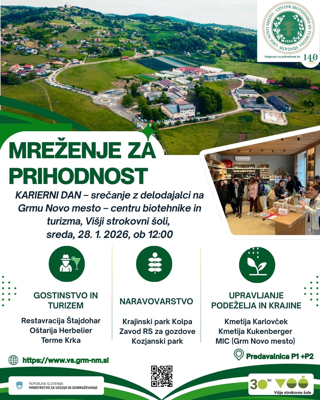 Na Grm Novo mesto – centru biotehnike in turizma je potekalo srečanje delodajalcev z dijaki in študenti, katerega namen je bil udeležencem približati možnosti zaposlovanja, opravljanja praktičnega izobraževanja ter nadaljnjega kariernega razvoja.