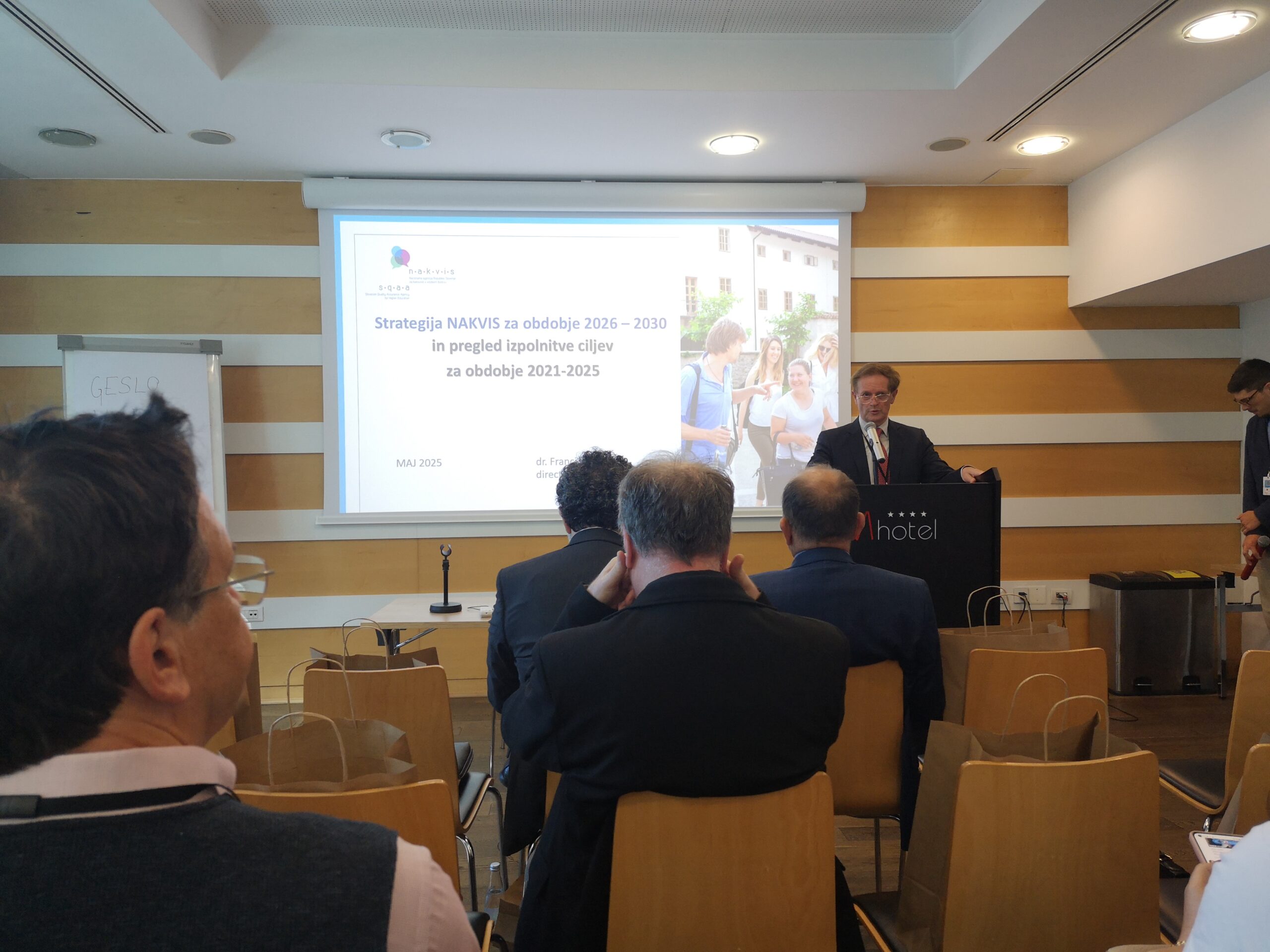 V četrtek, 29. 5. 2025, smo se udeležili posveta Nacionalne agencije RS za kakovost v visokem šolstvu (NAKVIS) z naslovom Snovanje strategije in vizije NAKVIS 2026–2030 ter izzivi evalvacijskih praks. S strani direktorja Nakvisa dr. Francija Demšarja so bila predstavljena izhodišča za novo strategijo in vizijo agencije za obdobje 2026–2030, prav tako pa tudi doseženi cilji iz iztekajoče se strategije. Mednarodni pogled na evalvacijske postopke v različnih regijah sveta je podal član upravnega odbora INQAAHE. Drugi del posveta so predstavljale tematske delavnice, kjer smo deležniki obravnavali izzive aktualnih evalvacijskih praks in analizirali pogoste teme presoj v akreditacijskih in evalvacijskih postopkih. Predstavljeni so bili primeri dobrih praks, ki so se razvili na podlagi evalvacijskih postopkov na posameznih šolah in fakultetah. Ena od delavnic je bila namenjena mikrodokazilom, kjer še potekajo prizadevanja za vključitev v Slovensko ogrodje kvalifikacij in v področne zakone. Izkušnje z razvojem mikrodokazil so predstavili deležniki, ki so jih razvili v sklopu pilotnih projektov iz Načrta za okrevanje in odpornost (NOO). Poudarjena je bila tudi vloga Nakvis pri sistemu kakovosti mikrodokazil.