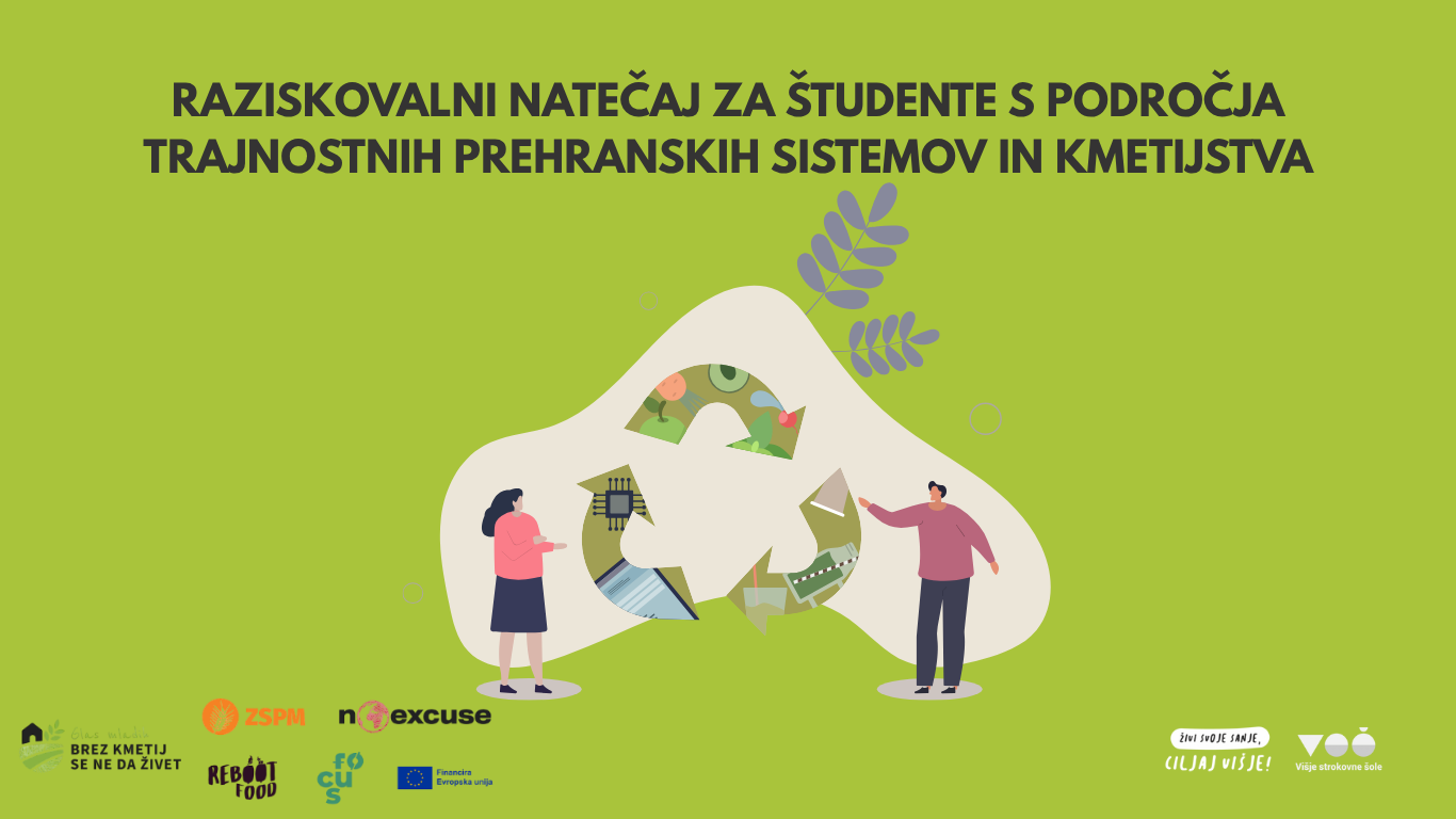 Projekt Glas mladih: Brez kmetij se ne da živet! razpisuje natečaj za diplomska in magistrska dela s področja trajnostnih prehranskih sistemov. K sodelovanju vabijo študentke in študente vseh študijskih smeri – tudi višjih strokovnih šol – s področij, kot so agronomija, okoljevarstvo, prehrana, sociologija, pravo, ekonomija in druga. Prijaviš se lahko z raziskovalnim delom, ki obravnava prehransko varnost, lokalno pridelavo hrane, prehranske politike, agroekološke pristope ali vlogo mladih, žensk in manjšin v prehranskem sistemu. Rok za oddajo je 15. oktober 2025, prijavo pošlji na info@noexcuse.si. Nagrade vključujejo 150 € za 1. mesto, 50 € za 2. mesto in materialno nagrado za 3. mesto. Več informacij lahko najdeš tukaj.